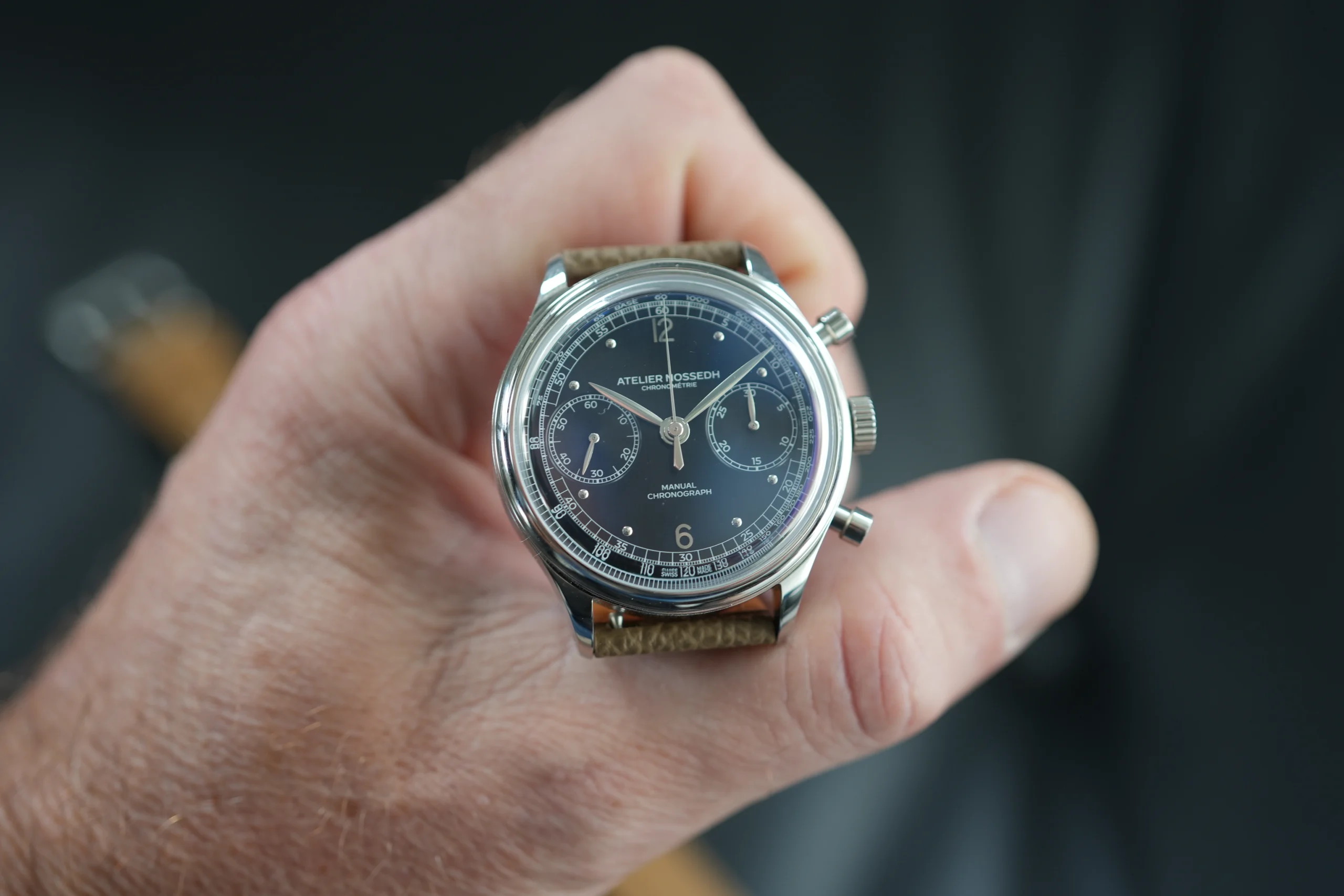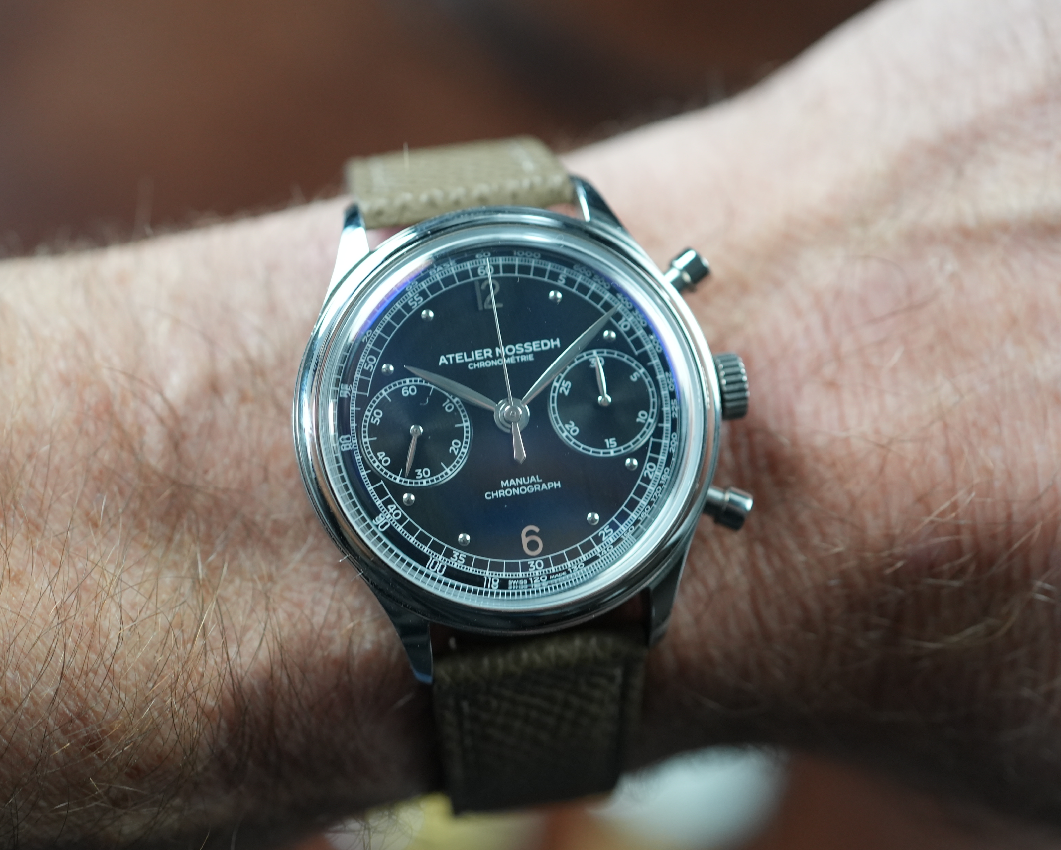 The Atelier Nossedh AN.01 is a refined, vintage-inspired chronograph with a compact 37 mm case. It is powered by a Swiss Sellita SW510 M manual wind movement and finished with a clean, beautiful blue dial that feels timeless and versatile.