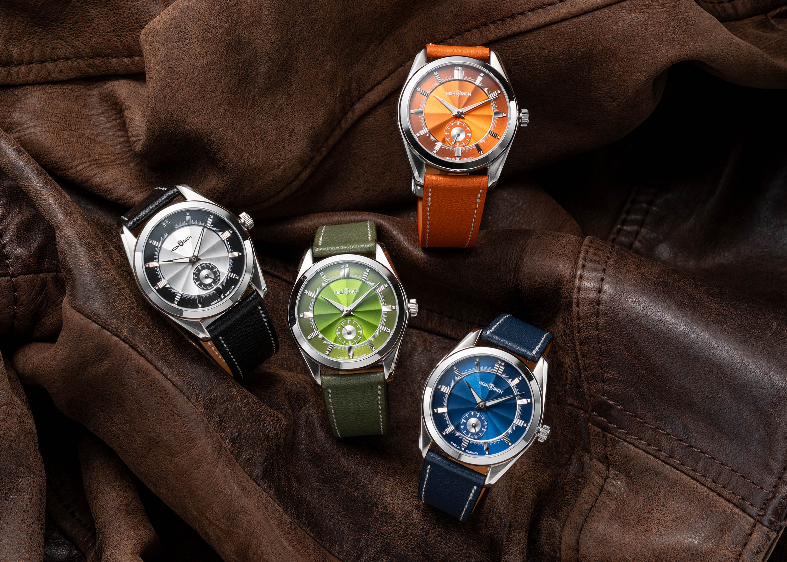 The Heinrich Radiance comes in a wide range of dial colours, letting collectors choose a look that suits their taste - including green, blue, silver, orange, purple, mocha, and black finishes, all with the same dynamic sunburst sector pattern. The Heinrich Radiance is fitted with a multi-link stainless steel bracelet featuring brushed steel links and a butterfly clasp. For added versatility, a secondary strap can be ordered, with options available in various rubber or leather colours , allowing you to tailor the watch to either a more casual or classic aesthetic.