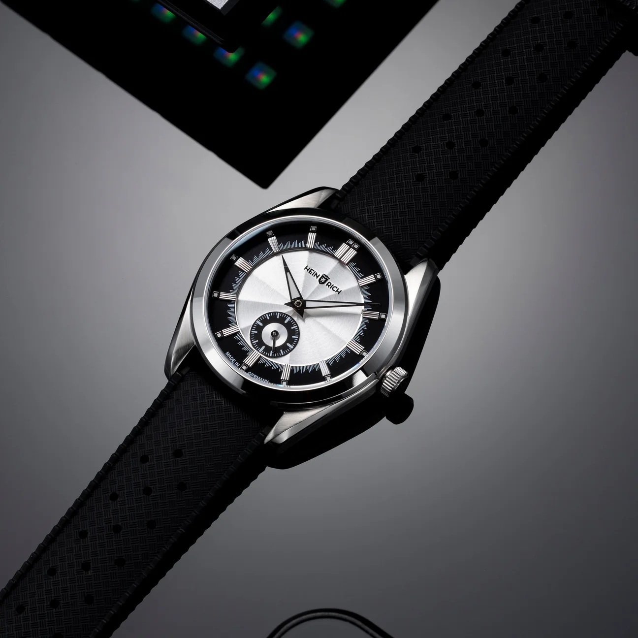 Heinrich, a brand known for its German-made watches with strong vintage influences, takes a more refined direction with the Radiance collection. The Radiance is their interpretation of a modern dress watch, deeply rooted in 1970s design language. The dial draws attention with its sector-inspired layout and circular brushed finishing. The centre section has a subtle sunburst surface layered with a gentle wave texture, segmented by the hour divisions. The small seconds subdial positioned at 6 o’clock mirrors the silver and black tones of the main dial, creating a sense of harmony across the design. Surrounding this are the hour and minute markers. The minute markers are arranged with varying heights rather than uniform lines, introducing a distinctive visual rhythm. Paired with applied markers and lume-filled accents in squares, the overall composition looks carefully balanced and rich in detail.