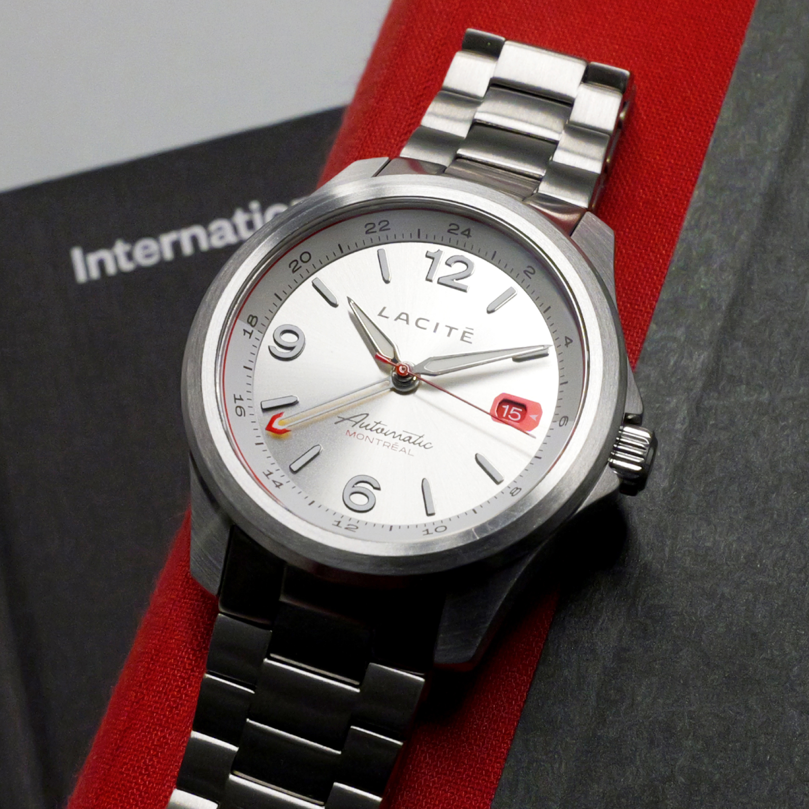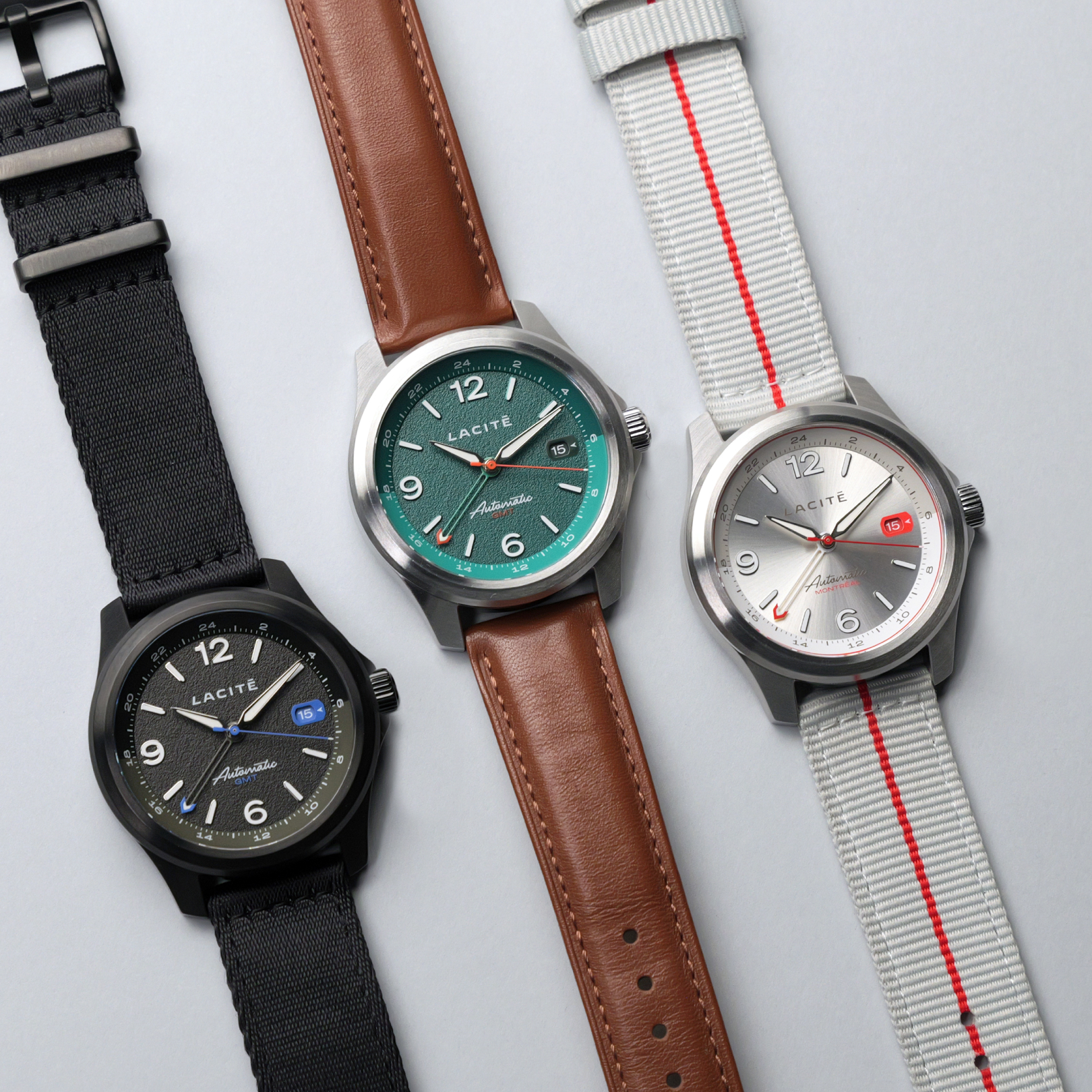 The Urbanite GMT is the debut release from Montréal-based Lacité. Housed in a 40.5 mm stainless steel case and distinguished by its silver dial with red accents, It features a practical GMT and date function, powered by the Miyota 9075 automatic true GMT movement.