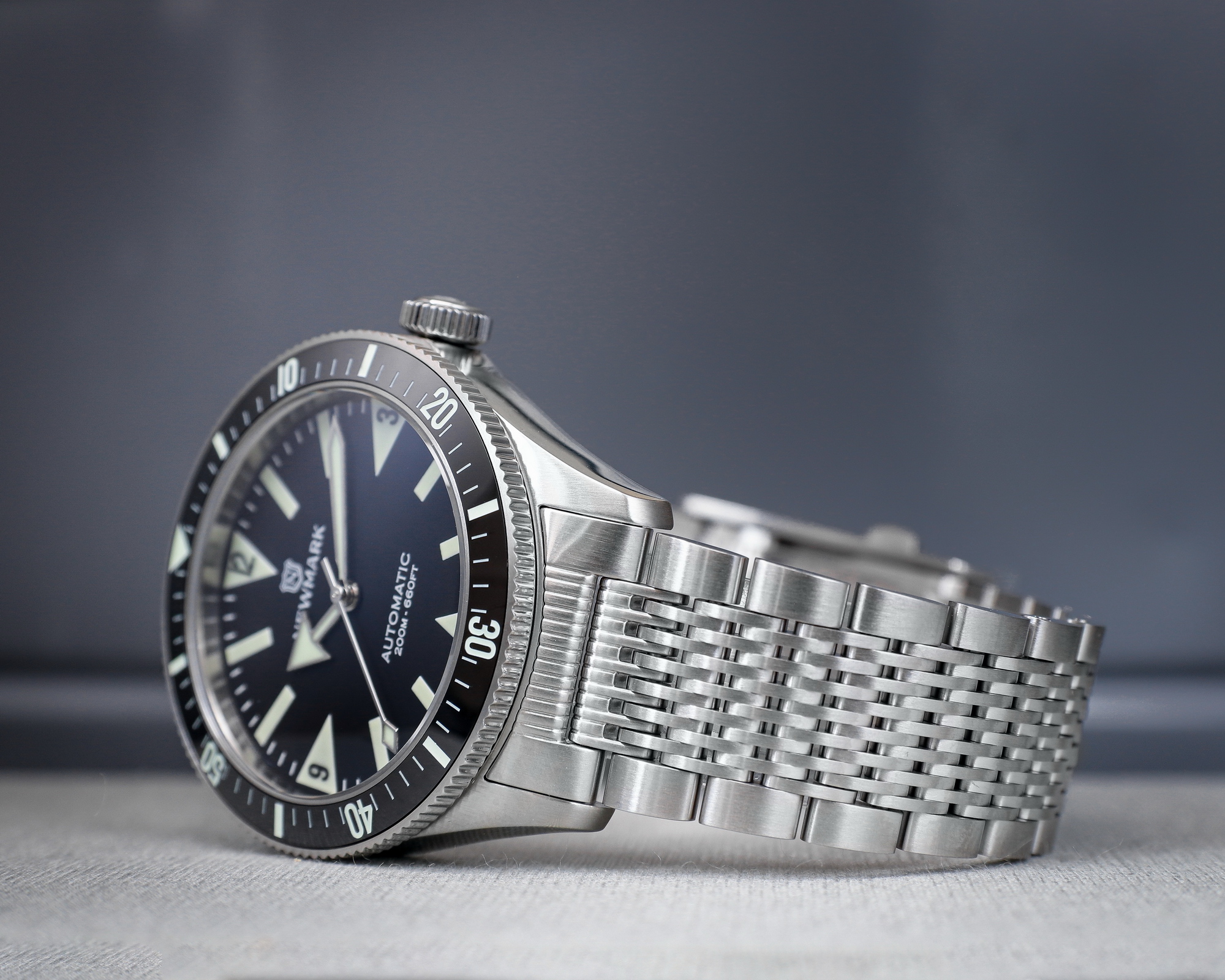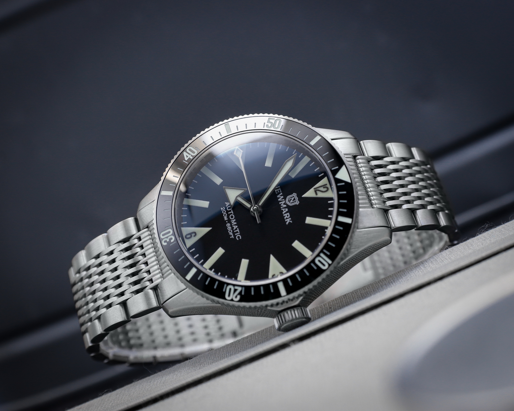 The Newmark 71 Sports – Black is a vintage-inspired sports watch that blends classic design with modern performance. Built around a 38 mm 316L stainless steel case with brushed and polished finishes, it offers 200 m water resistance, a 60-minute unidirectional bezel and a screw-down crown.