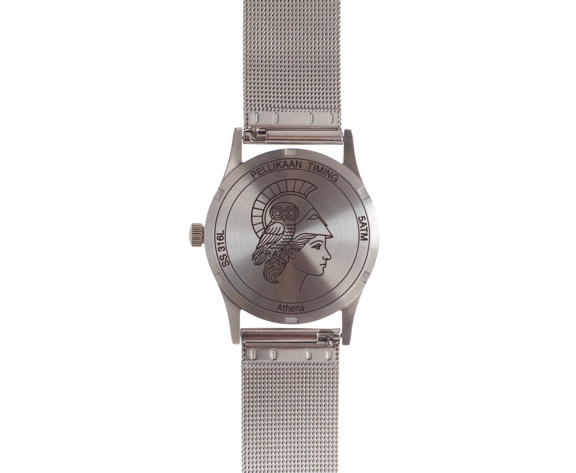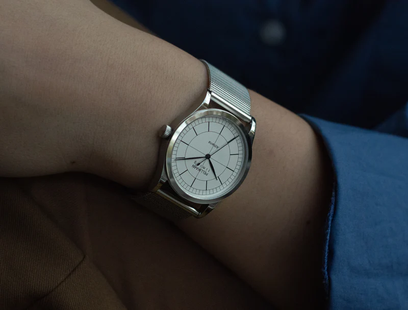 The Athena from Pellikaan Timing is a unisex timepiece with a 35 mm case diameter that sits between traditionally masculine and feminine sizes. It is powered by the ETA F06.412 quartz movement, known for its precision and long battery life.