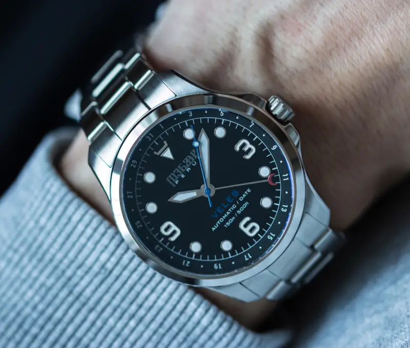 The watch is housed in a well-proportioned 40 mm stainless steel case and powered by a Swiss automatic movement with a practical date function, offering reliable timekeeping and everyday usability. Protected by a scratch-resistant sapphire crystal and rated to 150 m water resistance, the Veles Midnight Black blends durability, versatility, and style in a way that makes it both an eye-catching watch and a dependable daily companion. Its design reflects Perun’s commitment to clean, contemporary lines and thoughtful details.
