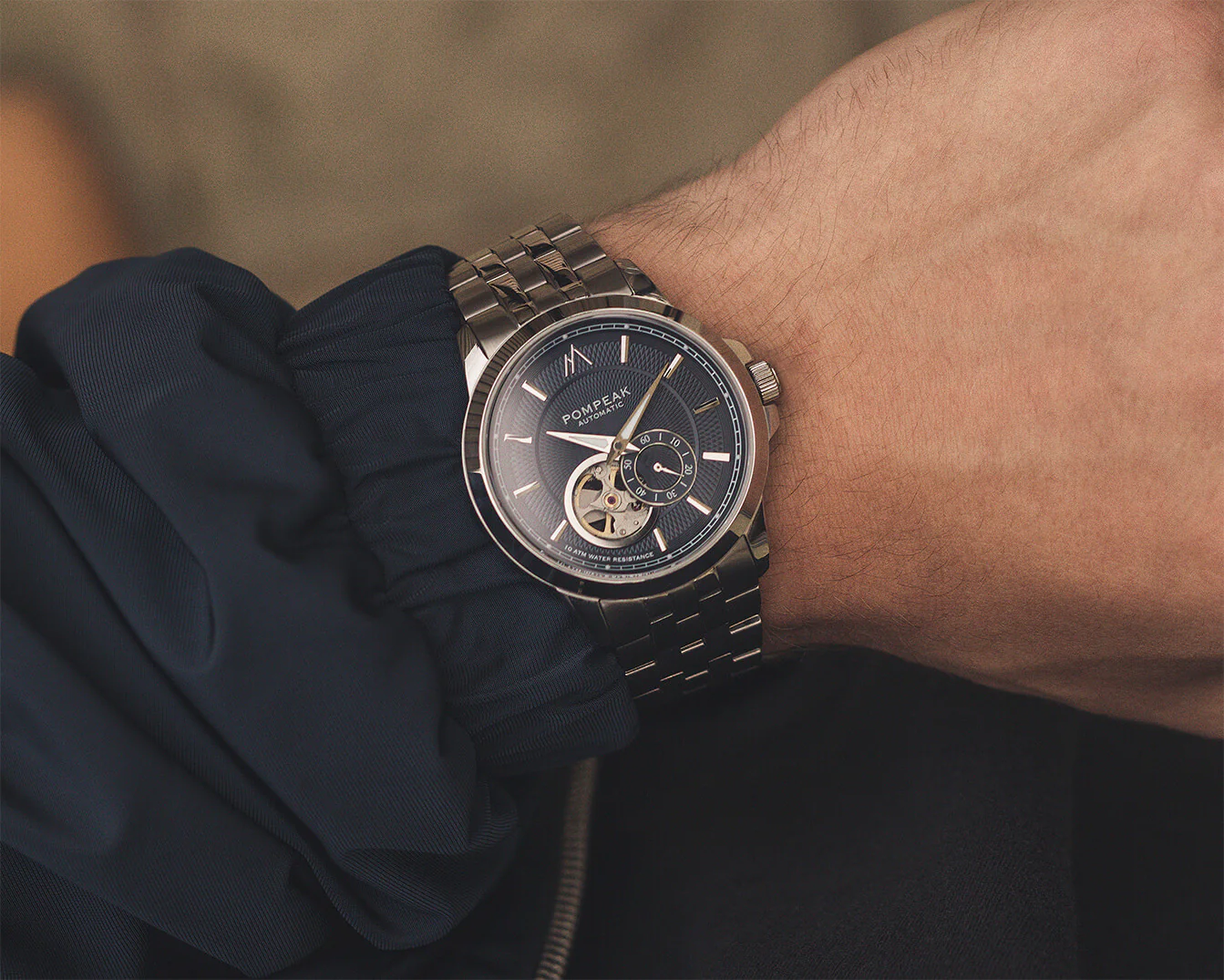 The Pompeak Gentleman’s Classic - Navy is a thoughtfully designed automatic watch from Pompeak, a British microbrand focused on creating accessible watches that blend classic aesthetics with reliable performance. The navy dial brings a quiet confident and classic look, pairing traditional watchmaking cues with modern aesthetics. The dial has a subtle guilloché texture that adds just enough detail to catch the eye, giving the watch a refined look without overwhelming its clean design. The open‑heart aperture adds a touch of mechanical theatre, revealing the rhythmic pulse of the Japanese automatic movement.