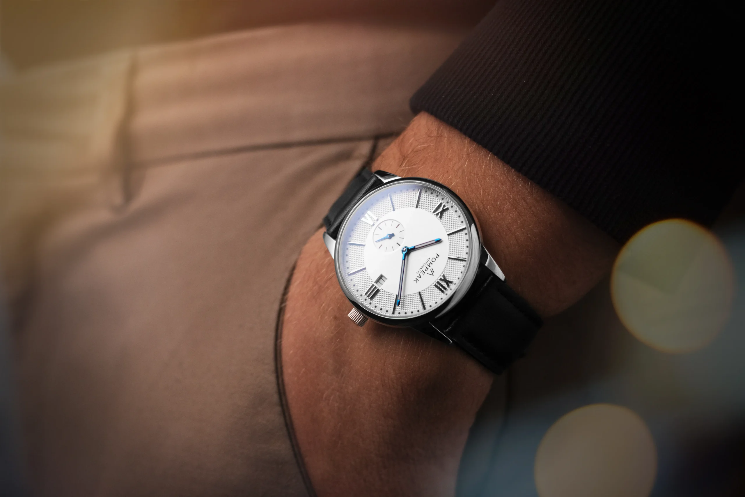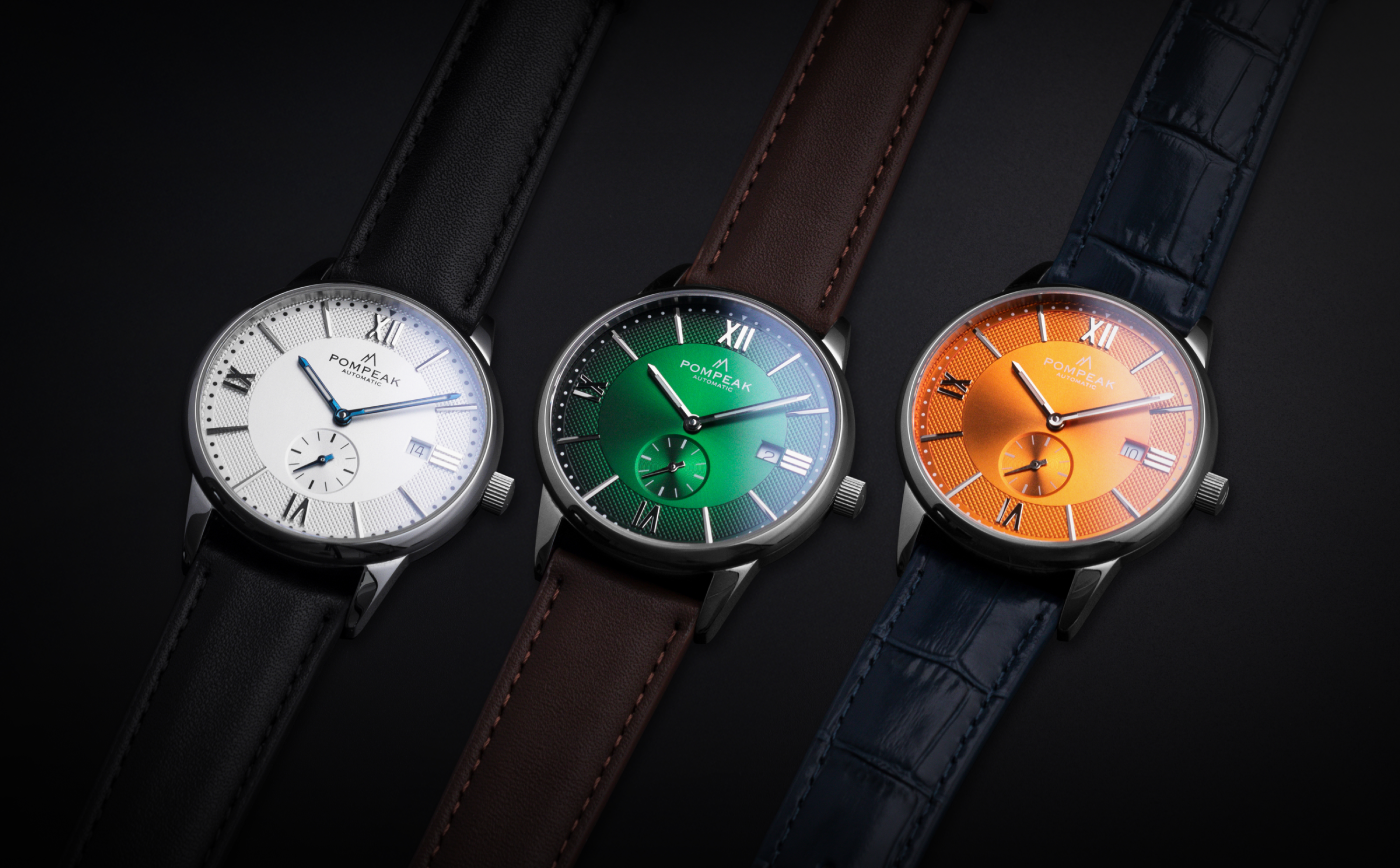 Pompeak is a British brand founded by two brothers with a shared passion for design and timekeeping. The Mallory - Timeless White is a refined dress watch that showcases Pompeak’s ability to blend timeless British design with Swiss precision. Designed and shipped from the UK, this model features a 40 mm polished 316L stainless steel case topped with a scratch-resistant sapphire crystal and a crisp white dial with heat-blued hands that elevate its classic aesthetic. At the 6 o’clock position, the watch features a small seconds sub-dial, a detail that enhances the dial’s balanced layout while adding a touch of elegance. The Mallory also features a date complication at 3 o’clock position, adding practical everyday functionality to its clean design.
