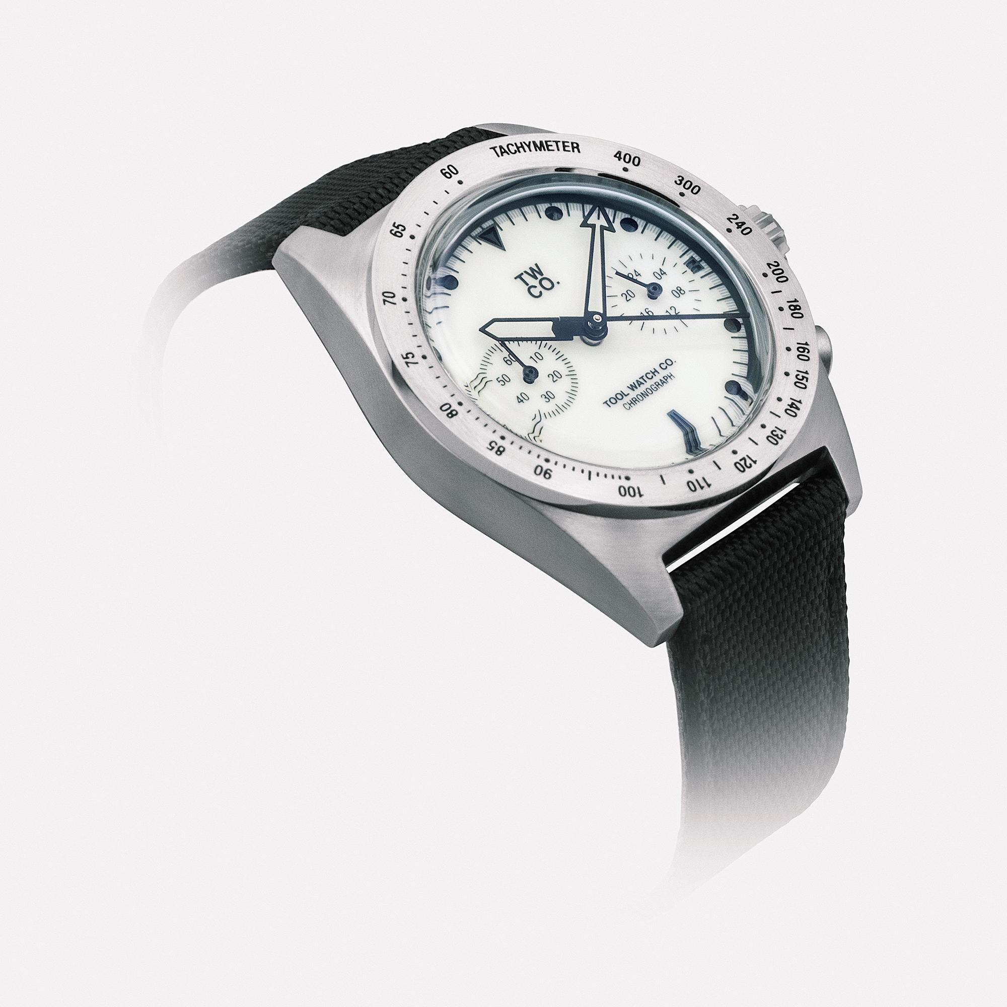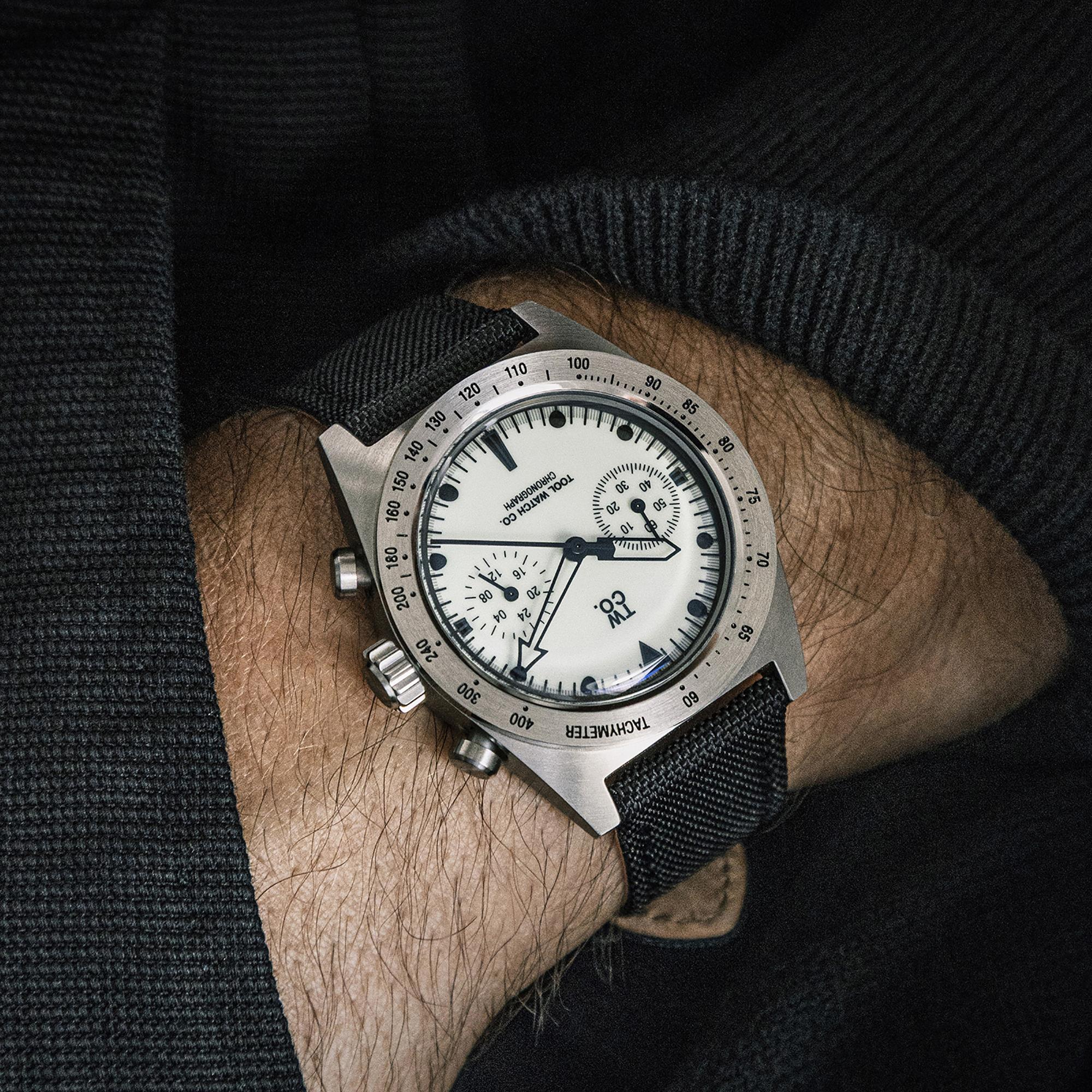 The Tool Watch Co. Lumecore Chronograph makes a first impression with a clean, purposeful dial and thoughtfully proportioned case. At 38 mm across, the brushed stainless steel suits a wide range of wrists, and the fully lumed Flint White dial ensures visibility in varied lighting. The contrasting hands and chronograph registers keep the dial legible and balanced.