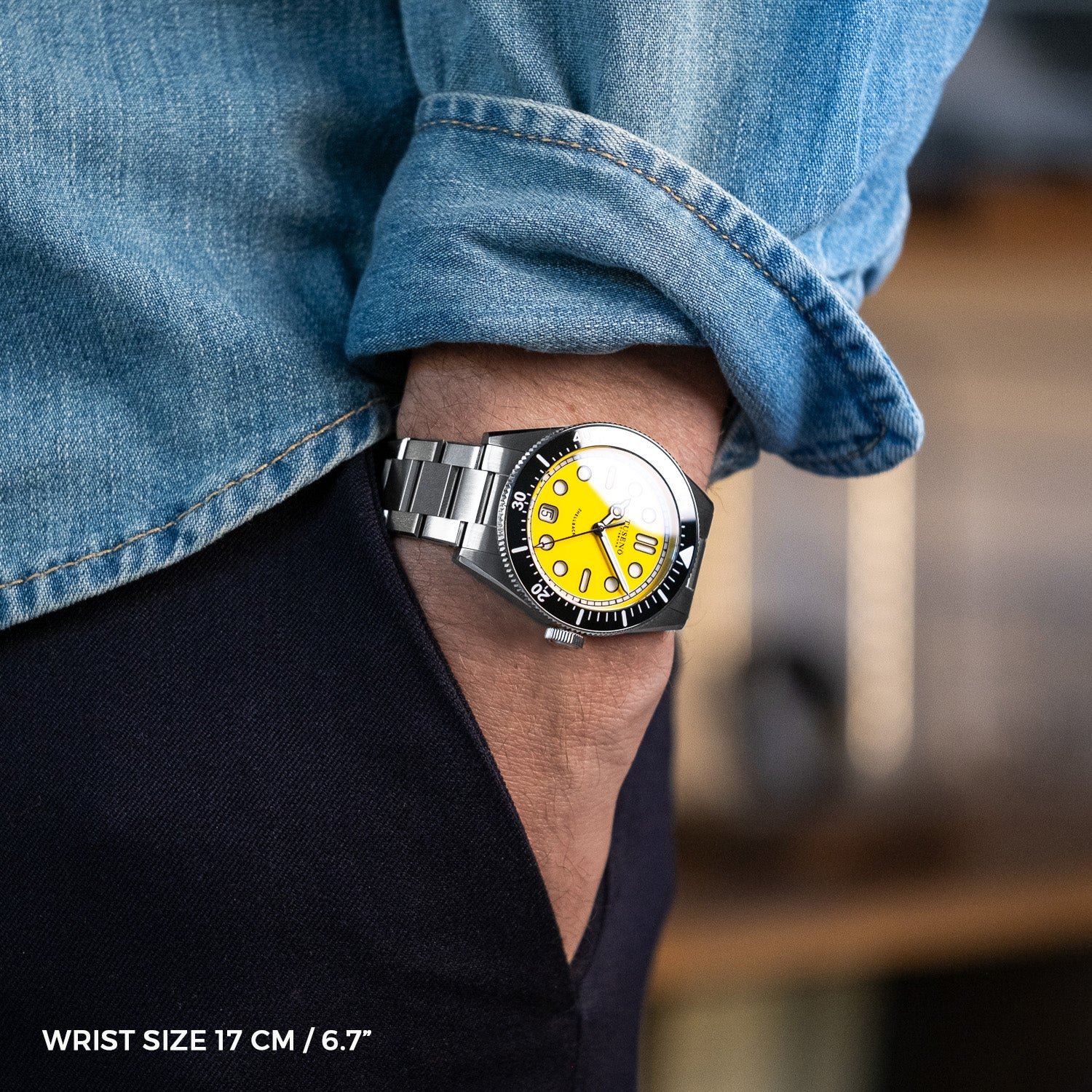 - The vibrant yellow dial of the Shellback V2 catches the eye with its bold yet balanced colourway, creating strong contrast with the hands, markers and bezel. This look will particularly appeal to those who enjoy colourful and distinctive dive watches that still read clearly at a glance.